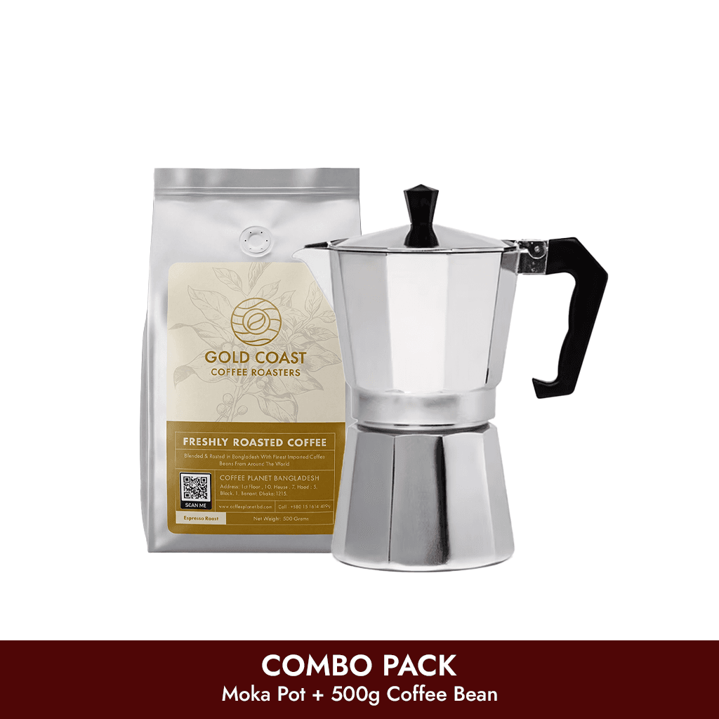 Popularly searched in Bangladesh as moka pot, stovetop espresso maker, Italian coffee maker, and coffee beans for moka pot—this combo is ideal for strong coffee lovers and beginners alike.
